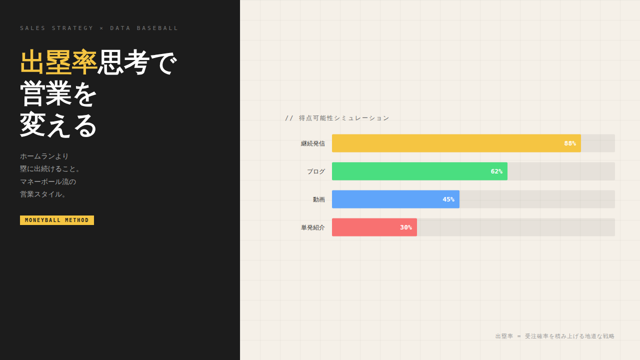 営業においても「ホームランを狙う」スタイルと「出塁率を上げて得点の可能性をじわじわ高める」スタイルがあります。